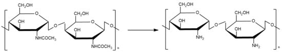 The production of chitosan requires the deacetylation of chitin; this process can be modulated through concentration, temperature, and time [7]. Scheme 1 shows the changes produced in chitin after being transformed into chitosan.