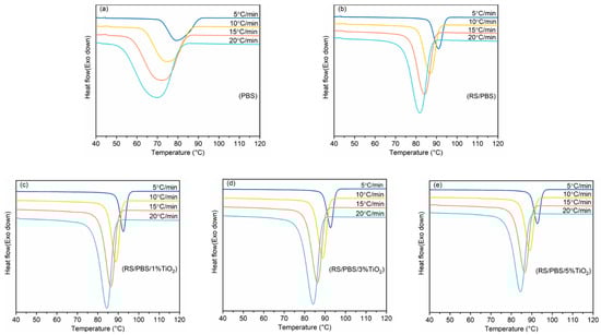 Non-isothermal melt crystallization curves of (a) PBS, (b) RS/PBS, (c) RS/PBS/1%TiO2, (d) RS/PBS/3%TiO2, and (e) RS/PBS/5%TiO2 under different cooling rates.