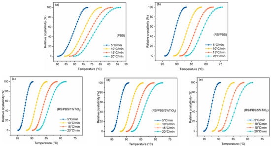 The relative crystallinity versus crystallization temperature for (a) PBS, (b) RS/PBS, (c) RS/PBS/1%TiO2, (d) RS/PBS/3%TiO2, and (e) RS/PBS/5%TiO2 at various cooling rates.