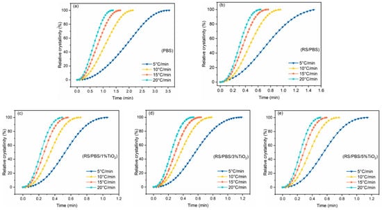 The relative crystallinity versus crystallization time for (a) PBS, (b) RS/PBS, (c) RS/PBS/1%TiO2, (d) RS/PBS/3%TiO2, and (e) RS/PBS/5%TiO2 at various cooling rates.