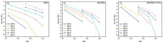Ozawa plots of versus for the non-isothermal crystallization of (a) PBS, (b) RS/PBS, and (c) RS/PBS/1%TiO2.
