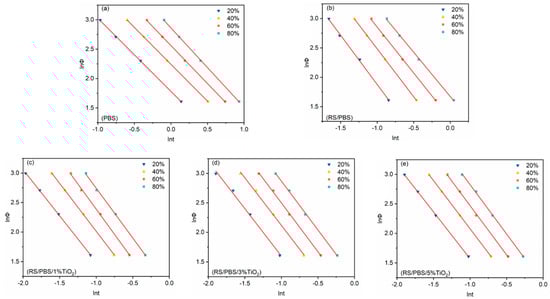 Avrami plots of versus for the non-isothermal crystallization of (a) PBS, (b) RS/PBS, (c) RS/PBS/1%TiO2, (d) RS/PBS/3%TiO2, and (e) RS/PBS/5%TiO2.