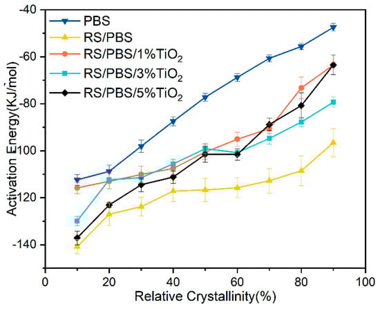 As can be seen from Figure 7, the values of were negative for all samples, indicating that the crystallization of polymers was a spontaneous process. For a given sample, the activation energy monotonically increased as the relative crystallinity increased, indicating that as the crystallization proceeded, it became more difficult to crystallize in each polymer system. At a given relative crystallinity, the activation energy of RS/PBS composites was lower than that of neat PBS, indicating that the presence of rice straw fiber promoted the crystallization of PBS. However, the activation energy of TiO2-incorporated RS/PBS composites was between that of the RS/PBS composites and neat PBS, and the activation energy decreased as the TiO2 content increased.