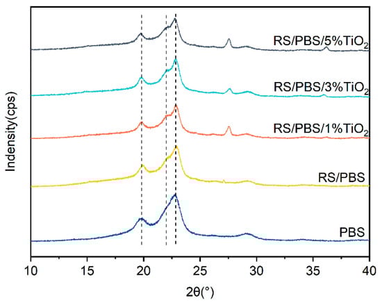 Figure 8 shows the XRD patterns of PBS and the composites. Three typical characteristic X-ray peaks of PBS were observed at 19.8°, 21.8°, and 22.7°, which correspond to the (020), (021), and (110) planes of PBS, respectively [59]. Peaks of TiO2 also appeared in the XRD patterns. It can be seen that the characteristic peaks of the RS/PBS composites and the TiO2-incorporated RS/PBS composites were similar to those of neat PBS, indicating that rice straw fiber and TiO2 did not significantly change the crystalline parameters of the PBS matrix. The diffraction peaks of the TiO2-incorporated RS/PBS composites shifted to slightly higher angles compared with the RS/PBS composites. This indicates that the incorporation of TiO2 into the PBS matrix did not alter the crystal forms and that the corresponding interplanar spacings changed [55].