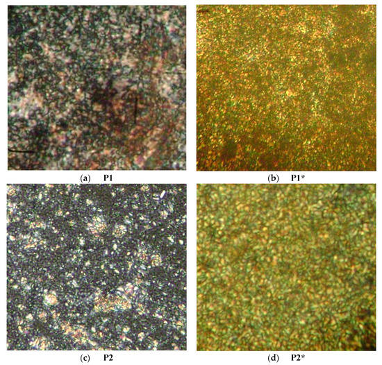 A series of poly(azomethine sulfones)s were synthetized according to [13]. They were solubilized in DMF to give 1% solutions, which were casted on glass lamella and incubated for 72 h at 50 °C to give thin films. Ordered thin films were prepared by thermal treatment of the thin films on a hot stage under polarized light, heated at 10 °C/min up to the mesophase state, annealed for 30 min, and quenched at room temperature. Thus, two series of films were prepared. The untreated films were abbreviated P1–P4, and the treated films, P1 *–P4 *. The thickness of the films before thermal treatment was around 1.6 μm (P1: 1.84 μm, P2: 1.58 μm; P3: 1.05 μm, P4: 0.38 μm).
