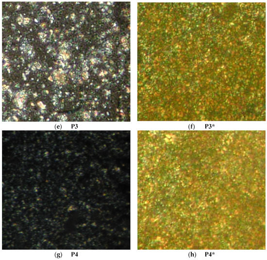 A series of thin films of aromatic poly(azomethine)s (Figure 1), in ordered state, were prepared by thermal treatment under polarized light. Thin films obtained by casting without any thermal treatment were used as reference in order to evaluate the influence of the ordering on electrical conduction. As can be seen in Figure 2, the ordered films presented intense birefringence, with a fine Schlieren texture, indicating a nematic mesophase in which the azomethine rigid mesogens were preponderantly aligned parallel to a local director [22,23,24,25]. The texture clarity was correlated to the percentage of mesogen in the polymer, with more resolved textures observed for polymers containing 75% (P2) or 50% (P3) mesogens. Furthermore, the ordered films did not present any cracks or defects, suggesting that continuous ordered films were formed (Figure 2a–d) [26]. The untreated films presented rare birefringent domains into a dark field under polarized light, indicating that the rare ordered domains dispersed into an amorphous one (Figure 2e,f). Moreover, under normal light, it was also seen that the thermal annealing supported the formation of a continuous film without defects, while cracks were present in the untreated film.