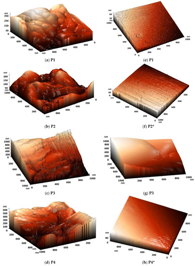 Representative 3D AFM images of the (a–d) untreated and (e–h) treated thin films acquired on squares of 1000 × 1000 nm and (c) the graphical representation of their roughness exponent (RE (P): roughness exponent of the untreated samples; RE (P*): roughness exponent of the treated samples).