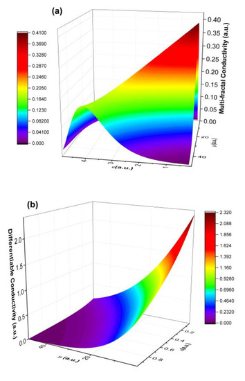 We present in Figure 5a,b the theoretical dependencies of and for , and the restriction . By selecting clear resolution scales for particular types of conductivity, it was possible to address both various interaction scales and fractalization degrees. Conduction in complex systems is performed through specific mechanisms dependent on scale resolution. As a consequence, we made a distinction among differentiable conduction , nondifferentiable conduction , and global conduction . Conduction mechanisms at the two types of scale resolutions are simultaneous and reciprocally conditional. Thus, the values of and increase along with increases in the ordering degree (synchronous type conductions), and with increases in the multifractalization degree, values increase and values decrease (asynchronous type conductions). We also noticed that higher degrees of multifractalization were seen as a higher mismatch in long scale orientation of the polymer. In the framework of the model, this read as losses in the inflection point of the trajectory. The conductivity of the polymer in the multifractal interpretations was seen as a measure of the available electron fluid to be transferred in different points of the material. The flow of the current was well characterized by the multifractal hydrodynamic model; thus, in each inflection point of the electron trajectories, losses could have appeared and thus led to lower conductivity. There was also an optimum at which we could obtain relatively higher conductivity. This point was unstable, as the system was overcome by losses and the conductivity decreased again. With decreases in the fractalization degree, we observed an exponential-type increase in conductivity.