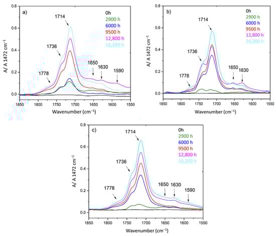 Changes in the FTIR spectrum (obtained in ATR mode) of the Si-XLPE matrix filled with 0 phr (a), 25 phr (b), and 50 phr (c) of ATH, during radio-thermal exposure in air under 8.5 Gy·h−1 at 47 °C.