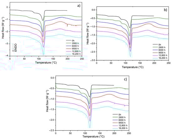 Changes in the DSC thermogram of the Si-XLPE matrix filled with 0 phr (a), 25 phr (b), and 50 phr (c) of ATH, during radio-thermal exposure in air under 8.5 Gy·h−1 at 47 °C.