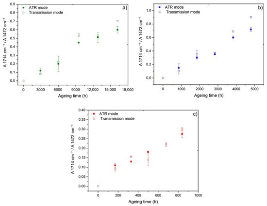 Changes in the carboxylic acid index measured with two different IR methods (i.e., in ATR and transmission modes) for the unfilled Si-XLPE matrix during its radio-thermal exposure in air under 8.5 Gy·h−1 at 47 °C (a), under 77.8 Gy·h−1 at 47 °C (b), and under 400 Gy·h−1 at 21 °C (c).