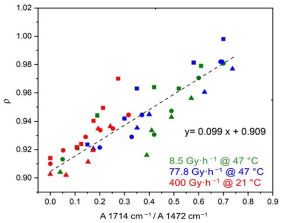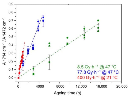 Figure 3 shows the changes in the carboxylic acid index (i.e., the ratio between the absorbances at 1714 cm−1 and 1472 cm−1) during the radio-thermal ageing of the unfilled Si-XLPE matrix in air, for the three dose rates under investigation, at low temperatures close to ambient. To demonstrate the reliability of this oxidation indicator regardless of the IR method under consideration, the values obtained in ATR mode in this study are compared to the values obtained in transmission mode in a previous publication [11]. A satisfactory agreement between both IR methods can clearly be observed, i.e., between an exclusively surface measurement with the ATR mode and an entire volume measurement with the transmission mode. Not only does this satisfactory agreement allow the use of the ATR mode for monitoring the radio-thermal oxidation kinetics in this study to be validated, it also allows the claim that the kinetics is not controlled by the oxygen diffusion, i.e., that films of about 500 µm thick are homogenously oxidized throughout their thickness.