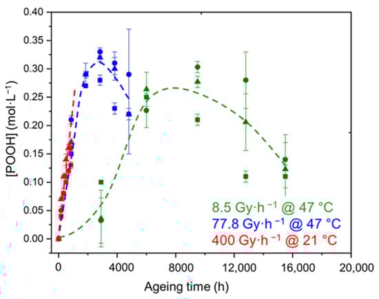 Changes in the POOH concentration of the Si-XLPE matrix filled with 0 phr (□), 25 phr (Δ), and 50 phr (○) of ATH, during its radio-thermal exposure in air under 8.5 Gy·h−1 at 47 °C (green), under 77.8 Gy·h−1 at 47 °C (blue), and under 400 Gy·h−1 at 21 °C (red). Dashed lines are guides for the eye.