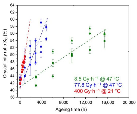 As already explained in Section 2.3, radio-thermal oxidation leads to a predominance of chain scissions over cross-linking, which induces chemi-crystallization, increasing the crystallinity ratio without affecting the melting temperature (i.e., the main crystalline lamellae) of the Si-XLPE matrix. As previously seen for the oxidation kinetics (Figure 4), the ATH fillers also have no influence on the chemi-crystallization kinetics of the Si-XLPE matrix (see Figure 6).