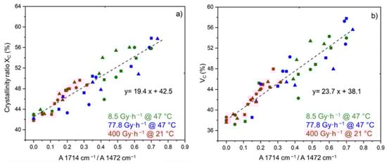 The two crystallinity ratios and , measured for the three ATH fractions, and the three exposure conditions under study, are plotted as a function of the carboxylic acid index in Figure 7. In both cases, a straight-line relationship was found between the oxidation and chemi-crystallization kinetics, thus confirming that carboxylic acids are, with aldehydes, the main oxidation products from chain scissions in the Si-XLPE matrix. Based on these results, the following two proportionality equations can be proposed: