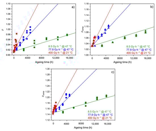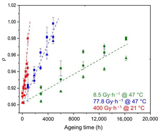 Changes in the density of the Si-XLPE matrix filled with 0 phr (□), 25 phr (Δ), and 50 phr (○) of ATH, during its radio-thermal exposure in air under 8.5 Gy·h−1 at 47 °C (green), under 77.8 Gy·h−1 at 47 °C (blue), and under 400 Gy·h−1 at 21 °C (red).