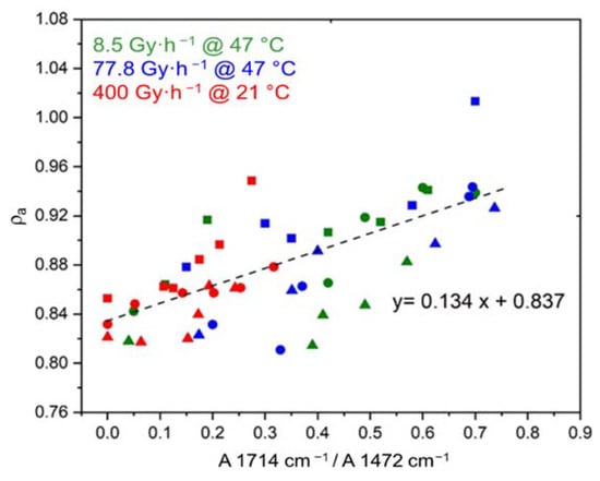 However, chemi-crystallization is not the only phenomenon responsible for the increase in the density of the Si-XLPE matrix during radio-thermal exposure. Indeed, oxygen consumption leads also to a significant increase in the density of its amorphous phase (see Figure 9), so that the total increase in the density of this semi-crystalline polymer must be written as follows [33]: