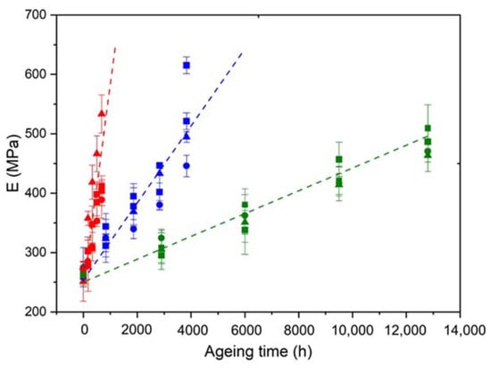 The consequences of radio-thermal oxidation for the fracture properties were determined by uniaxial tensile testing on small dumb-bell samples taken with an H2-shaped punch in the films before their thermal exposure. These samples were 75 mm long, 12.5 mm wide at both extremities, and about 0.5 mm thick. The useful rectangular part between the two sample heads (i.e., where failure occurs in tension) was 20 mm long, 4 mm wide, and about 0.5 mm thick. These samples were progressively loaded in tension using an Instron 5500K8810/4505H2190 machine (Instron, High Wycombe, UK) with a constant crosshead speed of 50 mm·min−1 at 23 °C under 50% RH, until their breaking point, according to standards ISO 527-1:2012 and ISO 527-2:2012 [48,49].