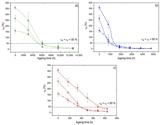 For each material and each radio-thermal exposure condition under study, the elongation at break was plotted as a function of exposure time, and the corresponding lifetime was graphically determined using the conventional end-of-life criterion for electrical cable insulation in the nuclear industry, i.e., when .