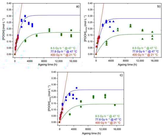 The same conclusions can be drawn for the changes in the POOH concentration in the early periods of exposure (see Figure 5). However, it can also be observed that, after a certain duration corresponding to a critical value of the POOH concentration determined in a previous publication [11], the build-up of POOH suddenly slows down, so that the concentration reaches a maximum value and then starts to decrease. This behavior can simply be explained by the fact that the formation of POOH (through the propagation of oxidation) competes with its thermal decomposition. Indeed, as the rate of the thermal decomposition of POOH is proportional to [POOH]2 this second initiation reaction can only significantly impact the oxidation kinetics when a sufficient concentration of POOH is formed in the Si-XLPE matrix. Based on this observation, a new kinetic model was recently developed for predicting the radio-thermal oxidation kinetics of the unfilled Si-XLPE matrix [11]. Its main characteristics are briefly recalled in Appendix A.