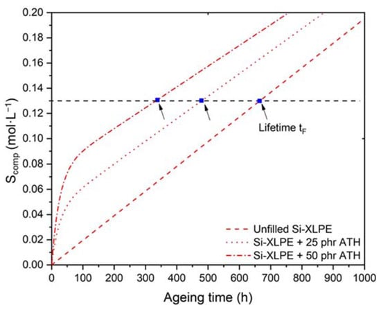 where S is the coefficient of oxygen solubility in the Si-XLPE matrix. Typical values of S reported for low-density polyethylene (LDPE) in the literature are about 1.8 × 10−8 mol·L−1·Pa−1, regardless of the temperature [52]. As an example, in the case of ageing in air under atmospheric pressure with Pa, we obtain mol·L−1.