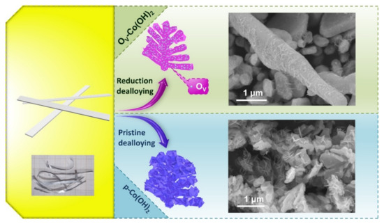 The Co5Al95 alloy foil was prepared using the melt-spinning technique in a controlled argon-protected atmosphere. The reduction–dealloying procedure was performed in 100 mL of 2 M NaOH solution containing NaBH4 at 30 °C until no visible bubbles emerged (about 12 h), then soaked in 100 mL of 0.1 M NaOH solution to remove residual Al; OV−Co(OH)2 was then obtained. Finally, thorough washing with distilled water many times and drying under a vacuum were carried out. The p–Co(OH)2 was prepared in 2 M NaOH solution without adding NaBH4 with other factors fixed.