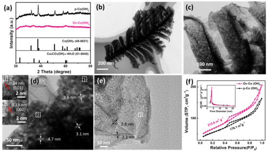 (a) X-ray diffraction patterns of p–Co(OH)2 and OV−Co(OH)2; (b,c) transmission electron microscopy images of OV−Co(OH)2; (d) high-resolution transmission electron microscopy (HRTEM) images of the dendrite section of OV−Co(OH)2; (e) HRTEM images of the covered nanoflakes of OV−Co(OH)2; (f) N2 adsorption and desorption isotherms and the corresponding pore size distribution (inset) of OV−Co(OH)2 and p−Co(OH)2.