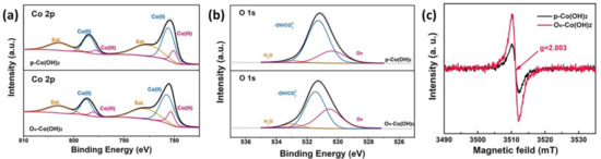 X-ray photoelectron spectra of Co 2p (a) and O1s (b) for p–Co(OH)2 and OV–Co(OH)2; (c) electron spin resonance spectra of OV–Co(OH)2 and p–Co(OH)2.