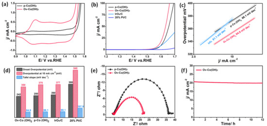 The electrocatalytic behaviours were investigated using CV curves, as shown in Figure 4a. Two redox couples were assigned to the Co3+/Co2+ and Co4+/Co3+ redox in the CV curves of p–Co(OH)2 and OV−Co(OH)2, respectively, at 1.08 and 1.42 V vs. RHE [30]. The broadened double-layer and negatively-shifted redox couplings showed that the OV−Co(OH)2 possessed a larger capacity area, which was not only due to the increase of specific surface, but also likely related to the existence of oxygen vacancy [31]. The presence of vacancies had a specific oxidation effect on Co−based materials, which favoured OER [14]. The electrocatalytic activity towards OER was determined by the LSV curves, as shown in Figure 4b. The OV−Co(OH)2 had a lower onset overpotential of 242 mV for OER than the OV−Co(OH)2 (250 mV), as well as a significantly faster increase in current density. As a result, the OV−Co(OH)2 required a lower overpotential of 350 mV than the p–Co(OH)2 (375 mV) to achieve a current density of 10 mA cm−2. These results showed that the introduction of OV significantly improved the electrocatalytic performance of OER. Commercial Pt/C did not show an OER catalytic activity, but commercial IrOx showed a benchmarking level of OER activity. Kinetic analyses of OER were performed using Tafel plots and EIS. The Tafel slope of the OV−Co(OH)2 (64.9 mV dec−1) was smaller than those of p–Co(OH)2 (66.1 mV dec−1) and IrOx (81.1 mV dec−1), as shown in Figure 4c, the introduction of OV enhances the reaction rate and electrocatalytic kinetics. Surprisingly, both OV−Co(OH)2 and p–Co(OH)2 showed superior electrocatalytic activities and kinetics when compared to commercial IrOx, which should be attributed to the similar dendrite hierarchical structure providing an abundance of active sites. Simultaneously, as shown in the Nyquist plots of EIS (Figure 4e), a lower charge-transfer resistance is observed for OV−Co(OH)2, showing a more efficient charge transport of the OV−Co(OH)2 during the electrocatalytic process. These results showed that the kinetics of OER were enhanced by the introduction of oxygen vacancies and the formation of a dendrite hierarchical structure. The stability of OV−Co(OH)2 was further determined using chronopotentiometry, as shown in Figure 4f. After 12 h of testing at 350 mV overpotential, the current attenuation was less than 4%, supporting the stability of the OV−Co(OH)2. Altogether, these results showed that the OV−Co(OH)2-containing oxygen vacancies had an effective and stable OER performance.