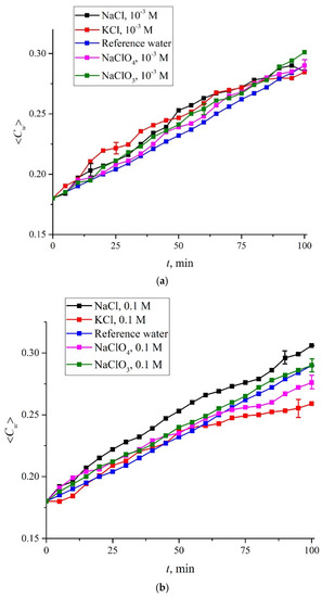 It is natural to assume that the specific effect of various ions in our case will manifest itself precisely due to the inhibition of the coalescence of gas bubbles at concentrations above 0.17 M for NaCl and KCl salts and the absence of the inhibition effect in the entire concentration range for NaClO