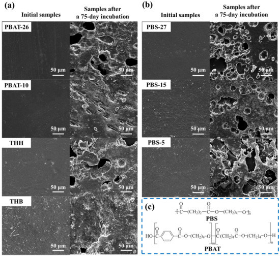 SEM images of (a) PBAT film with different carboxyl end group content (PBAT-26 and PBAT-10), PBAT film filled with carbon black (THH) and CaCO3 (THB) before and after a 75-day degradation; (b) PBS film with different molecular weight (PBS-27, PBS-15 and PBS-5) before and after a 75-day degradation. (c) Molecular structure of PBS and PBAT.