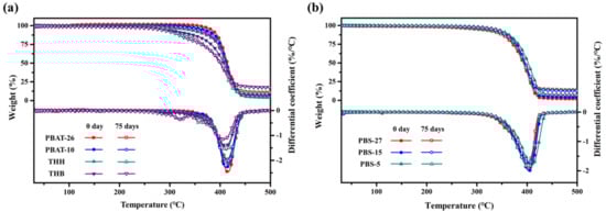 TGA curves of (a) PBAT and (b) PBS mulching films before and after a 75−day degradation.