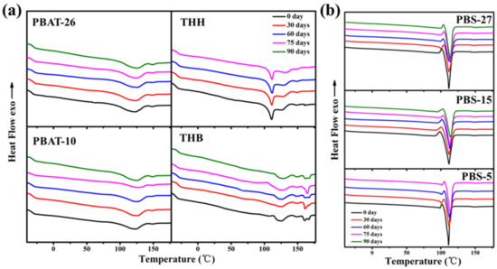 The amorphous regions in polyester are usually more susceptible to microorganisms and enzymes than the crystalline regions. The butylene adipate (BA) units and butylene terephthalate (BT) units in PBAT form a co-crystallization or a mixed-crystallization structure. The biodegradation and hydrolysis in the vulnerable aliphatic polyester units leads to a higher degree of structural regularity of the material during the degradation process and an elevation in the melting temperature, as shown in Figure 3. The melting enthalpy obtained by integrating the secondary melting peak area also gradually increases. It can be seen that the melting temperature of PBS gradually rises, which can also reflect that the amorphous regions are preferentially degraded. A small crystallization peak can be found before the melting peak of PBS, which is attributed to recrystallization [28].