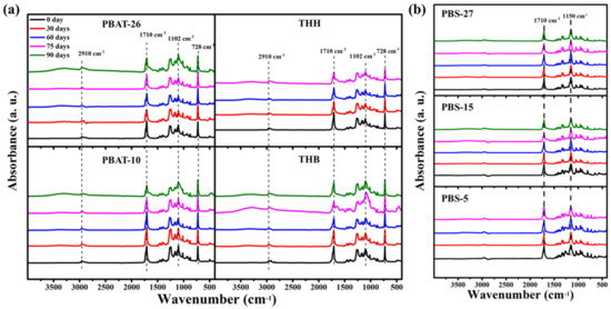 The FTIR spectra of (a) PBAT and (b) PBS mulching films before and after degradation.