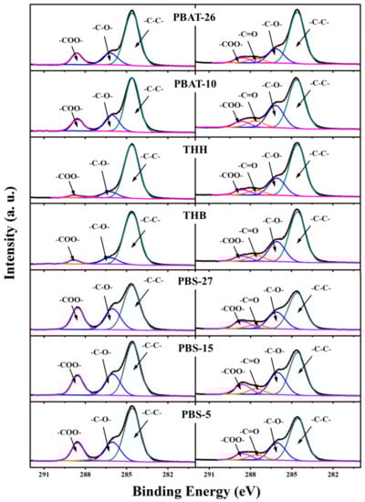 Figure 5 shows the C 1s core-level spectra of PBAT and PBS before and after 75 days of degradation. The C 1s core-level spectra can be curve-fitted into three peak components at BEs of 284.6, 286.3, and 288.6 eV, attributable to the C-C, C-O, and -COO- species, respectively. The peak component for-COO- is due to the ester linkages and the hydrolysate carboxyl in the biodegradable polyester. The peak component for C-O, meanwhile, is contributed by both the ester linkages and its hydrolysate. The hydrolytic degradation in blends owing to the cleavage of ester linkages and the reaction between water and the carbonyl groups forms the degradation products of hydroxyl- or carboxyl-terminated PBAT and PBS. The new peak of C=O at 287.7 eV in PBAT and PBS composites arises after the incubation in the simulation marine environment, which reveals the degradation of polymer films. The distinction between the characteristic peak intensity of PBAT before and after degradation is obvious, with the relative peak area proportion of C-O to -COO- increasing from 1.36 to 2.83 in PBAT-26 and from 1.54 to 3.55 in PBAT-10. Furthermore, the larger relative peak area of C=O in PBAT-10 demonstrates the higher degradation degree and rate of PBAT with more carboxyl end group. The relative peak area proportion of C-O to -COO- in THH is 2.79 and 3.36 before and after degradation for 75 days, while it is 1.91 and 4.42 in THB. The imperfect two-phase interface introduced in the polyester by the inorganic fillers promotes the degradation. After 75 days of degradation, the increase in relative peak area proportion of C-O to -COO- in PBS-27, PBS-15, and PBS-5 are 75%, 95%, and 112%, respectively. This result indicates that the degradation degree and rate of PBS-5 are the highest among the three formulations, which further demonstrates the negative correlation between the molecular weight and the degradation of polyester.