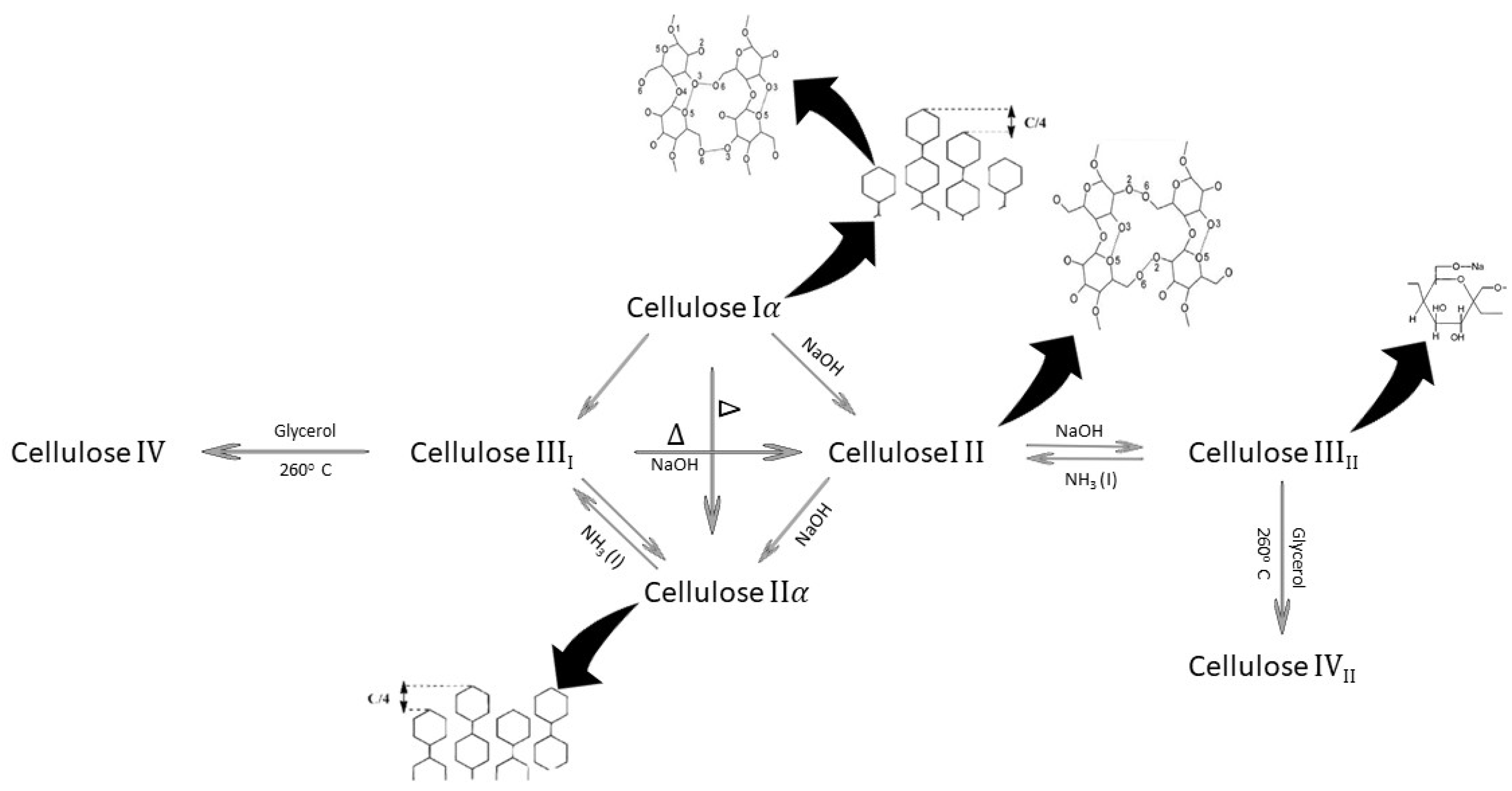 - Peter, Z. Order in cellulosics: Historical review of crystal structure research on cellulose. Carbohydr. Polym. 2020, 254, 117417. [Google Scholar] [CrossRef] [PubMed]