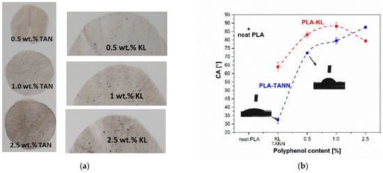 Figure 2a,b first shows the images of PLA-KL and PLA-TANN films with a homogeneous distribution of KL and TANN in the polymer material. Due to the native darker color of KL and TANN, the PLA composite material is darker, which could be explained by a suitable mixture between polyphenolic filler and PLA.