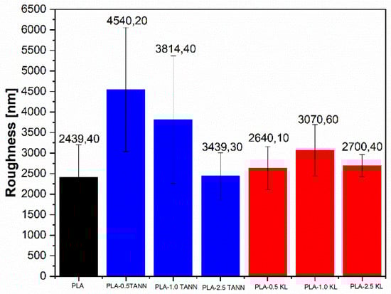An average roughness value of neat PLA, PLA-TANN, and PLA-KL composites.