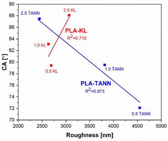 In general, the trend of change in the water contact angle of PLA-KL and PLA-TANN composites agrees well with that of surface roughness, indicating the distribution of KL and TANN in PLA composites and varies in different deep layers of PLA-KL and PLA-TANN composites (Figure 4). From the correlation plot between CA and roughness (Figure 4), the correlation coefficient for PLA-TANN is high (0.973), indicating higher linear strength, while the lowest correlation coefficient is calculated for PLA-KL (0.715), which is still considered strong.
