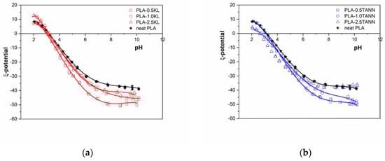 Zeta potential of (a) PLA-KL composites and (b) PLA-TANN composites in the range of pH 2–12.
