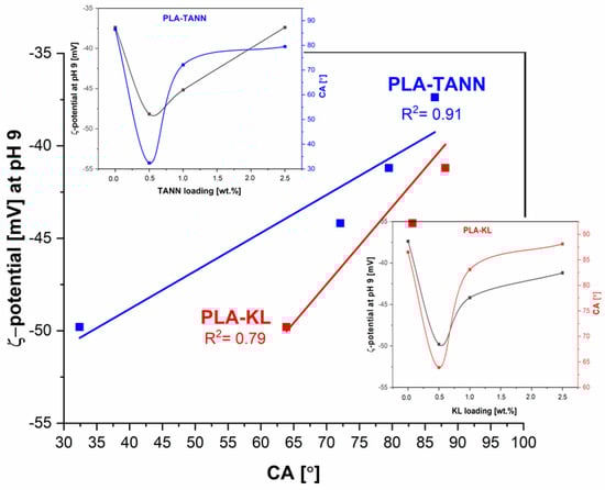 The correlation between the plateau zeta potential at pH 9 and polyphenolic filler loading in PLA-KL and PLA-TANN composites. The insets show the dependence on CA, zeta potential at pH 9, and polyphenol loading.