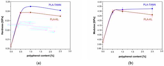 In general, the surface mechanical properties of PLA-KL and PLA-TANN composite films were correlated to roughness as well as the contact angle measurement using goniometry, surpass zeta potential, and nanoindentation. Finally, the antioxidant/antimicrobial activity of the developed composites was also estimated using standard methods (DPPH• (2,2′-diphenyl-1-picrylhydrazyl), DSM 1576) [,]. Reinforcement with two different polyphenols, KL and TANN, resulted in promising multifunctionality of the material, allowing it to be used for both packaging and biomedical applications. However, the antioxidant reinforcing agents not only endow the composites with antioxidant activity but also improve their stability and prolong their shelf life. On the other hand, the additional antimicrobial activity of PLA composites provides a high quality microbial inhibiting material required for many advanced applications.