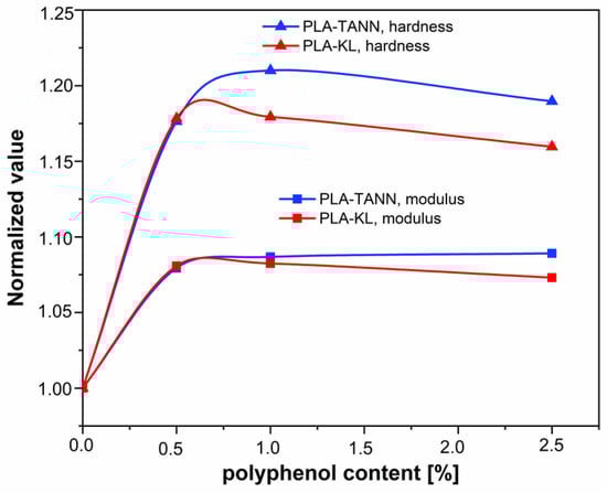 Figure 8 demonstrates normalized values of both measured properties, nanoindentation modulus and hardness, compared to the properties of neat PLA. Normalization has been done by the modulus and hardness value of neat PLA for all materials. It is visible that the addition of polyphenols affects hardness more than modulus measured by nanoindentation. While at low concentration of 0.5% the effect of KL and TANN are the same, for higher concentration TANN causes more pronounced increase of both mechanical properties.
