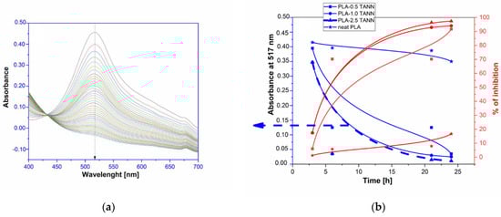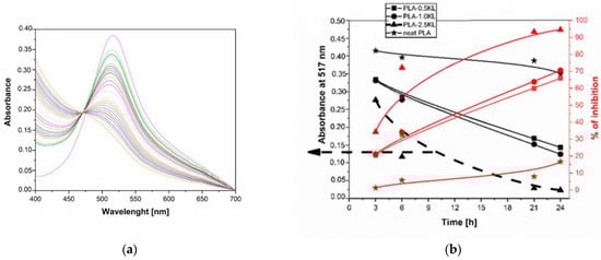 Figure 9 and Figure 10 show the dependence of UV-vis spectra of PLA-KL and TANN composites immersed directly in DPPH•-solution and measured at 517 nm, evaluated after 24 h (1, 12, 24 h). The results of antioxidant activity of PLA-TANN composites are shown in Figure 9. It can be clearly seen that neat PLA did not exhibit any antioxidant activity. The absorbance of neat PLA after 24 h slightly decreases and therefore provides around 17% of inhibition. With the incorporation of TANN into PLA, the antioxidant activity of the PLA-TANN composites increased and reached the max value after 24 h. Small differences between the PLA-TANN composites were measured, but the antioxidant activity is approximately independent of TANN loading. In general, the PLA-0.5 TANN composites after 24 h reach 91% of AO inhibition, the same value of AO inhibition 94% is measured for PLA-1.0 TANN composites. Furthermore, Figure 9 also shows that PLA-TANN composites containing 0.5 wt.% of TANN could reduce 50% of DPPH concentration after 10 h. Moreover, PLA-1.0 TANN and PLA-2.5 TANN composite films showed almost the same antioxidant activity up to about 17.5 h. The time-dependence study of the absorbance of PLA-2.5TANN composites measured every 3 min is also represented in Figure 9a.