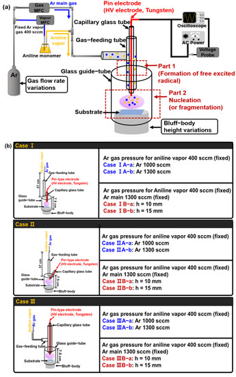 Moreover, this APPR was used with a single pin electrode configuration with no grounded electrode. In particular, in case I, the pin electrode was vertically placed in the center of a glass guide-tube parallel to the gas-feeding tube. In case II, the pin electrode was titled at ~50° on the side of the glass guide-tube and was also separated from the gas-feeding tube. In case III, the pin electrode was vertically combined into the gas-feeding tube on top of the glass guide-tube in the APPR to form excited radical spaces at the gas-feeding tube for large-area plasma expansion. The case III structure is largely divided into two parts. Part 1 forms the free excited radical for injecting the excited radical spaces in the gas-feeding tube. Part 2 is the region where the nucleation (or fragmentation) reaction occurs by the injected free excited radical species for polymer thin-film deposition.