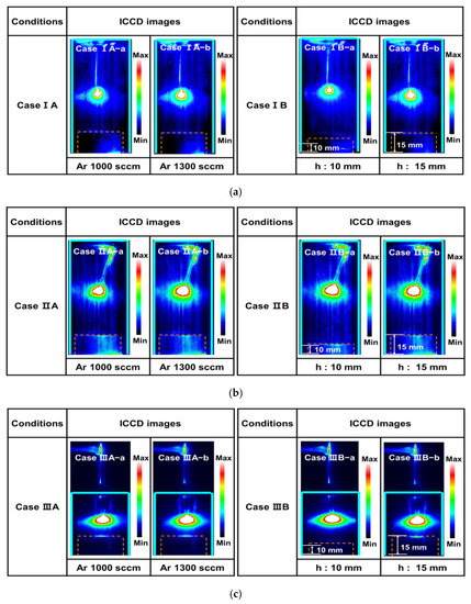 Figure 2 shows the ICCD images of plasma discharge generated by the proposed APPR with various case studies such as three electrode configurations, argon flow rates, and bluff-body heights. To optimize the geometry of the proposed APPR for large-area deposition, we investigated the various cases, namely, three different electrode configurations (cases I–III), two different gas flow rates, and two different bluff-body heights inside the guide-tube. The detailed case studies for generating plasma discharge are presented in Figure 1 and Figure 2.