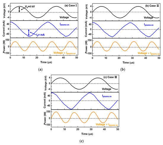To identify the discharge behavior of the APPR at an optimal condition for the three-pin electrode configurations (cases I, II, and III), the applied voltage, total current in plasma ON state, and instantaneous power were each measured as a function of time, and the results are indicated in Figure 3.