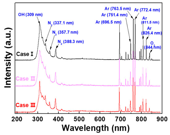 OES spectra of APPR under optimal conditions with respect to three electrode configurations of cases I, II, and III.