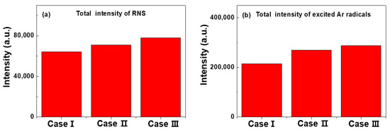 Total peak intensity of (a) excited RNS and (b) argon radicals from OES spectra under optimal conditions with respect to three electrode configurations of cases I, II, and III.