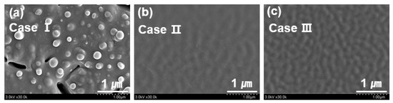 The morphologies of the deposited PANI thin films were investigated under the optimal conditions with respect to three electrode configurations. Figure 6 shows the SEM images of the deposited PANI thin films under the optimal conditions using the APPR with respect to three electrode configurations. For case I, spherical particles were observed on the surface of the deposited PANI thin film (Figure 6a). However, for cases II and III, the surface of the deposited PANI thin film was homogeneous and smooth (Figure 6b,c). Thus, these results show that the surface morphologies of PANI thin films are strongly affected by the pin electrode configurations of APPR.